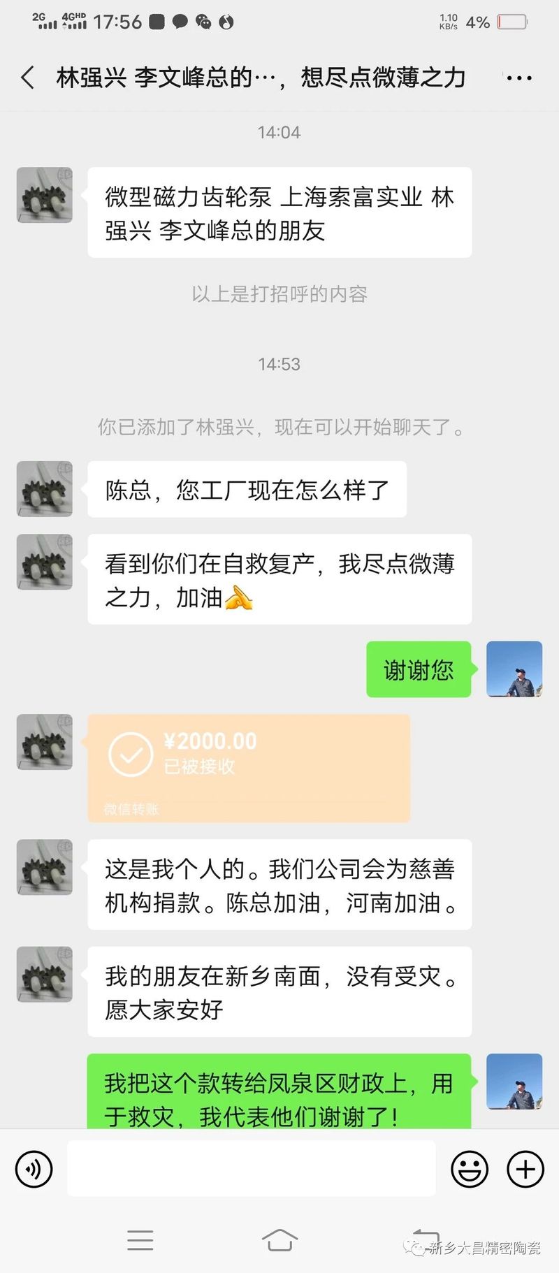 由于新鄉市特大暴雨造成新鄉許多地區受災嚴重,新鄉市大昌精密陶瓷技術有限公司也未能幸免,受災后公司員工積極自救,清理洪水淤泥,清點產品,檢修設備......看著受損的廠區情景無不為之心痛。洪水無情,大昌有愛,聽到公司受災的消息后,許多愛心企業發來慰問消息,上海索富實業有限公司林總還給予慰問金支持。其中鄭州市立新實業有限公司、沁陽市華貝爾科技有限公司、焦作市維納科技有限公司、新鄉市諾優義齒有限公司,送來了一批批愛心物資,包括純凈水、面包、方便面、蔬菜、雞蛋等,另外鄭州市立新實業有限公司還帶來了一臺凈水機,解決目前嚴重的飲水問題。一方有難,八方支援!感謝這些兄弟企業的愛心支持,真誠地謝謝你們!