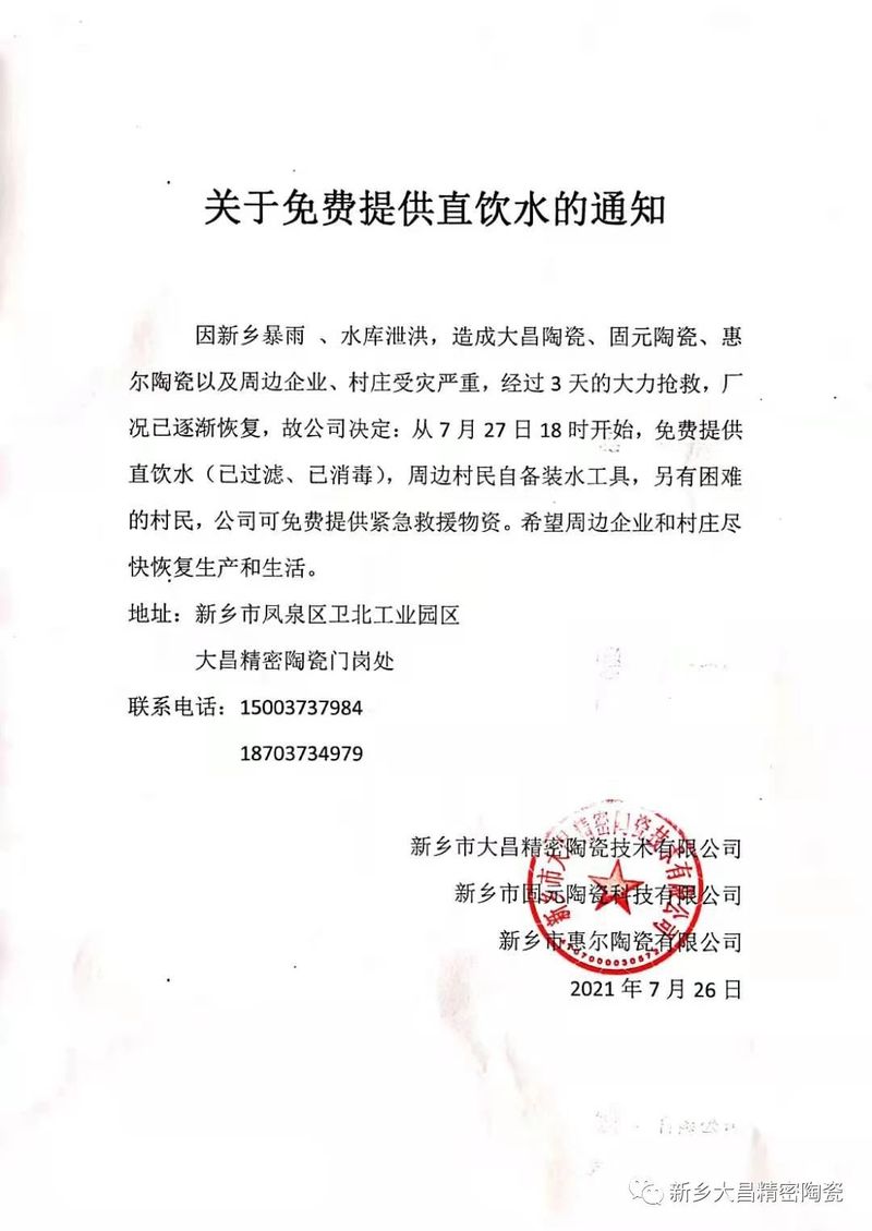 再次感謝大家的關心和支持,新鄉大昌陶瓷在黨和政府的關懷下,在兄弟單位和公司員工的鼎力相助下,定會眾志成城,抗洪救災,戰勝困難,復工復產,重建大昌美好家園!